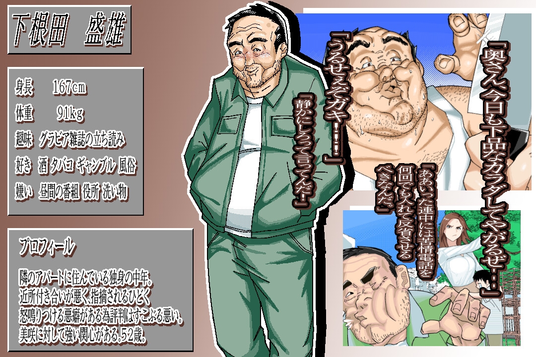 “下根田盛雄” 是一个没有朋友、在工作单位被人讨厌、没地位没金钱的最底层中年男人,他用尽各种手段,策划着要把女主角变成自己的女人。